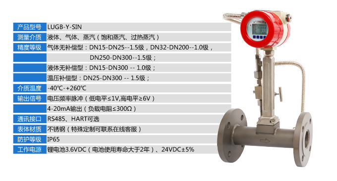 LUGB-SIN高精度渦街流量計對過熱蒸汽、飽和蒸汽、壓縮空氣和一般氣體、水和液體的計量和控制。加厚本體,可有效避免現(xiàn)場管道振動帶來的數(shù)據(jù)波動和誤差。